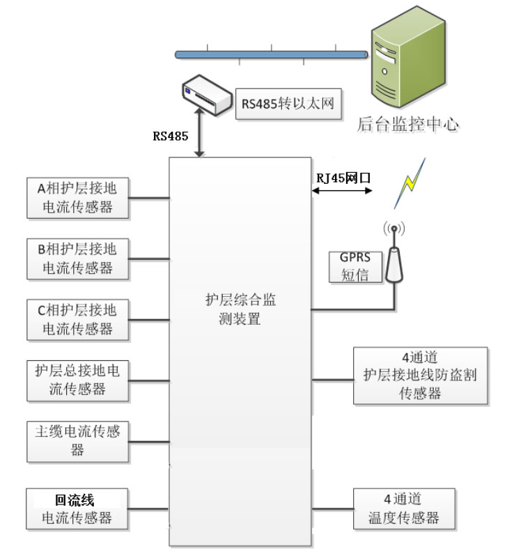 电缆护层综合在线监测装置采用了环流法原理,即:单芯电缆金属护套在正常情况下(即一点接地),金属护套上环流极小,主要是容性电流,而一旦金属护套出现多点接地与大地形成回路后,环流显著增加,严重时可达主电流的90%以上。实时监测金属护套环流及其变化量,即可实现单芯电缆金属护套多点接地故障的在线监测,从而及时的发现接地故障,从根本上避免电缆事故发生,可靠的运行。