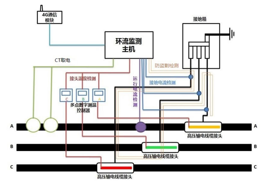 监测装置由监测主机和电流互感器、温度及防盗割传感器等组成实现。开口式电流互感器安装于电缆护层接地线及主缆上,经转换为二次信号后引入监测装置。温度传感器用于对电缆温度进行监测,防盗割传感器对环流接地线进行防盗割监测。